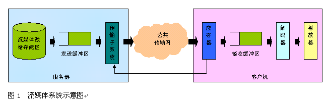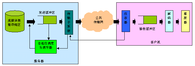 實(shí)時(shí)自適應(yīng)網(wǎng)絡(luò)帶寬的流媒體傳送技術(shù),是上海清鶴數(shù)碼科技公司的一項(xiàng)可大幅提高流媒體寬帶傳送過(guò)程中的關(guān)鍵服務(wù)質(zhì)量瓶頸的國(guó)際技術(shù)專(zhuān)利。我們知道,目前制約流媒體寬帶應(yīng)用發(fā)展的核心問(wèn)題在于服務(wù)質(zhì)量。簡(jiǎn)單地說(shuō),由于因特網(wǎng)的狀況是不可靠的,其帶寬、負(fù)荷等變化劇烈,這難以滿(mǎn)足流媒體寬帶業(yè)務(wù)的實(shí)時(shí)性服務(wù)質(zhì)量要求,并常常造成播放卡殼、延遲、視頻質(zhì)量抖動(dòng)劇烈等不良情況,給使用者感官造成很大影響。所以解決好流媒體寬帶應(yīng)用的服務(wù)質(zhì)量問(wèn)題對(duì)于流媒體寬帶應(yīng)用是極為重要的。如圖1所示,在一般的流媒體寬帶系統(tǒng)里,視頻服務(wù)器通過(guò)網(wǎng)絡(luò)向客戶(hù)機(jī)實(shí)時(shí)傳送流媒體信息。