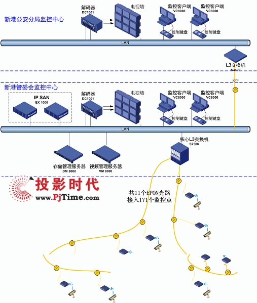 除了攝像頭與圖像顯示設備之外,整個監(jiān)控系統(tǒng)主要采用的都是H3C設備。系統(tǒng)用11(應改成10條,最終只用了10條)條EPON光路接入全部171個監(jiān)控攝像頭;并采用專業(yè)的EX1000存儲產品為120T關鍵歷史視頻數據的提供了高可靠性的存儲保護;而S7506、S3600交換機優(yōu)化的組播特性和特色的雙流技術則確保了所有監(jiān)控點的高清晰、高實時性、支持大量并發(fā)訪問。系統(tǒng)的集中管理、批量配置、全網網管也可以為新港開發(fā)區(qū)節(jié)省管理成本。
