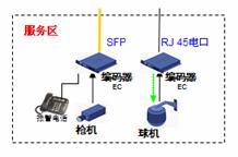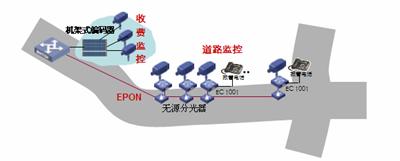 道路沿線監(jiān)控:采用EPON組網(wǎng),路況監(jiān)控球機接入前端編碼器,多個編碼器通過一根EPON光纖接入到中心交換機上,布線方便節(jié)省光纖資源。編碼器內(nèi)置交換機功能可以接入IP報警電話方便公路報警。還可以將支持IP接口的可變信號板和氣象站直接接入編碼器交換機端口,實現(xiàn)一網(wǎng)多用,降低整體網(wǎng)絡(luò)成本。
