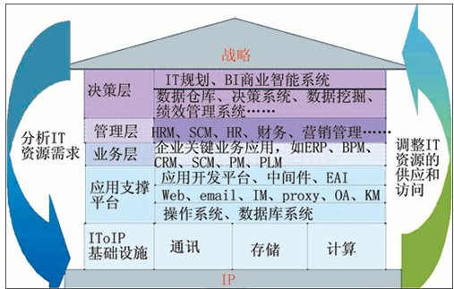 按照華為3Com的構想,如果把整個IT系統(tǒng)比做一座房屋,那么整個房屋的地基就是IP網(wǎng)絡,需要基于IP網(wǎng)絡來構建通信、存儲、計算等IT基礎設施。在這些基礎設施之上,則是應用支撐平臺(操作系統(tǒng)、數(shù)據(jù)庫系統(tǒng)、應用開發(fā)平臺等),基于應用支撐平臺提供給機構的關鍵業(yè)務流程信息系統(tǒng)(如ERP、SCM等),最終為用戶的管理和決策提供支持!霸趹(zhàn)略與IT基礎設施之間實現(xiàn)實時同步互動,IT為用戶高層提供商業(yè)智能系統(tǒng)、決策系統(tǒng),以便決策層即時掌握信息,作為機構戰(zhàn)略決策、戰(zhàn)略挑戰(zhàn)的依據(jù);用戶可以依據(jù)內、外部變化,進行戰(zhàn)略調整時快速分析新的IT資源需求,同步調整IT資源的配置,從而使IT與業(yè)務戰(zhàn)略保持同步!边@正是IToIP的基本理念。