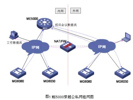 ME5000 提供4個以太網(wǎng)口,其中3個網(wǎng)口可以用來召開視訊會議,這3個網(wǎng)口可以跨越在不同的網(wǎng)段上,實現(xiàn)公、私網(wǎng)的穿越,同時也可以為用戶提供網(wǎng)絡負載均衡的功能。在存在防火墻的環(huán)境中,可以把ME5000的兩個網(wǎng)口分別布置在防火墻的兩側(cè),連接內(nèi)、外網(wǎng)的視訊終端,從而可以直接繞過防火墻進行開會,而不影響其它數(shù)據(jù)業(yè)務的安全,內(nèi)、外網(wǎng)進出數(shù)據(jù)業(yè)務時仍然會通過防火墻,網(wǎng)絡安全保護作用不受影響。