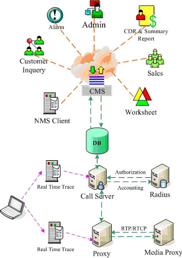 系統(tǒng)管理員通過Web和CMS對用戶進(jìn)行管理,并通過CS和PROXY所帶的網(wǎng)管功能(NMS)進(jìn)行實(shí)時的網(wǎng)絡(luò)監(jiān)控及維護(hù),及時診斷并處理故障。