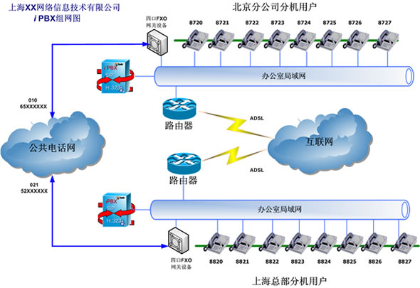 該公司于2005年4月先后購(gòu)買了兩套eTalk iPBX系統(tǒng),分別安裝于上?偛亢捅本┓止。并利用現(xiàn)有辦公室內(nèi)部網(wǎng)絡(luò)布設(shè)分機(jī)。