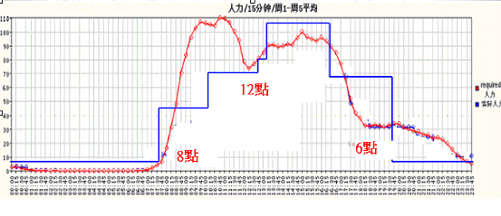 大家看到圖一中紅色的線,就是一天里面電話進(jìn)來的數(shù)量,藍(lán)色的線是安排的人力?梢郧宄吹剑涸缟8點(diǎn)一開始,電話就一直進(jìn)來;中午來電的客戶開始去吃飯,電話就開始下滑;然后等到客戶吃完中飯,電話又開始進(jìn)來,下午又出現(xiàn)另外一個(gè)高峰;一直到5點(diǎn)以后又開始下滑,6點(diǎn)以后電話相對就少很多。