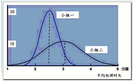 這是兩個班組的平均處理時長的頻次表,橫軸是平均處理時長的時間,縱軸是座席員數(shù)目,小組二的平均處理時長的平均數(shù)超過3分鐘,大約是3.1分鐘,有15人平均處理時長是在這個平均數(shù),而小組一的平均處理時長的平均數(shù)是2.5分鐘,有30人平均處理時長是在這個平均數(shù)(請看縱軸)。