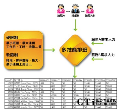 在實施人資優(yōu)化軟件之后,呼叫中心即可開始對各服務(wù)人力作"量"與"質(zhì)"的管理,確定資源做最佳運用,如下圖所示: