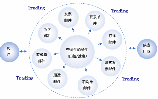 郵件是貿(mào)易中不可缺少的技術(shù)工具,郵件系統(tǒng)提供郵件的收發(fā)和管理,但是它并沒有提供和線索、活動、客戶、供應(yīng)商、訂單集成的功能。Trading