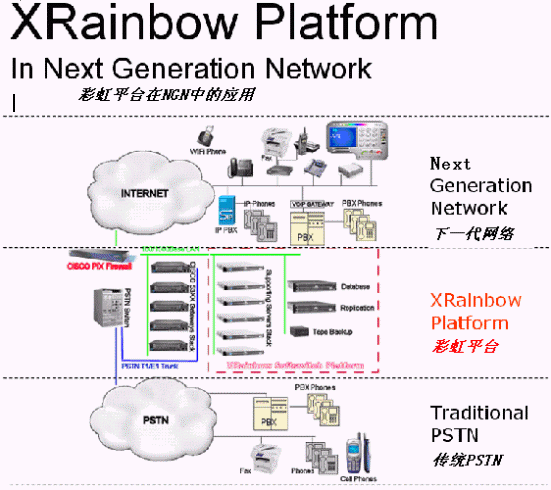 Xrainbow軟交換平臺它是基于SIP協(xié)議、針對中國現(xiàn)有Internet網絡狀況和現(xiàn)有網路硬件服務商的VoIP 設備的特點,為電信運營商和二級/虛擬運營商, 通信系統(tǒng)集成商提供運營于下一代新網絡(NGN, Next Generation Network)之上的一套集VoIP 語音及信號交換、管理及服務于一體的電信級系統(tǒng)平臺。X彩虹SIP軟交換系統(tǒng)包括以下的核心服務器如下認證服務器、路由服務器、配置服務器、功能服務器、語音郵件服務器、媒體轉發(fā)服務器和網絡管理服務器。我們的系統(tǒng)可以實現(xiàn)多種功能,功能模塊包括:監(jiān)控模塊、計費模塊、管理模塊、話吧模塊、代理商模塊、軟電話模塊、集團功能模塊、電話卡模塊、主叫認證模塊、回撥模塊、批發(fā)計費模塊、電話會議模塊等。