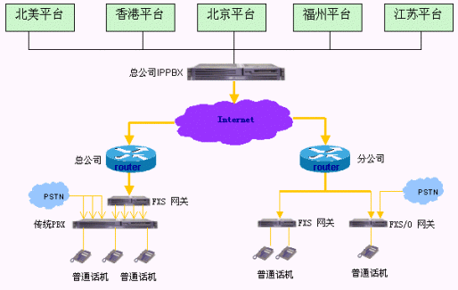 - 建設(shè)企業(yè)內(nèi)部的IP電話系統(tǒng),實(shí)現(xiàn)企業(yè)內(nèi)部各個分支結(jié)構(gòu)之間的免費(fèi)通話,即總公司之間、各個分支機(jī)構(gòu)之間、總公司與各個分支機(jī)構(gòu)之間通訊免費(fèi)。由于各地電話環(huán)境不同,各個分支機(jī)構(gòu)在使用內(nèi)部通話功能時候操作有些差異。