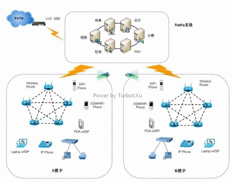 如果當(dāng)整個樓宇被WiFi網(wǎng)絡(luò)覆蓋,用戶可通過WiFi Phone或支持WiFi功能的PDA手機注冊到Netta交換系統(tǒng),如使用有線網(wǎng)絡(luò),用戶可通過Gateway