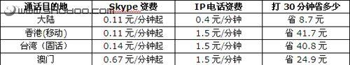 3G手機(jī)用Skype和固定電話(huà)通話(huà)的資費(fèi)與傳統(tǒng)IP電話(huà)相比如何呢?見(jiàn)下表: