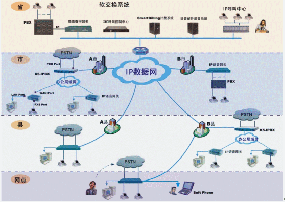 在各級辦公機構根據(jù)原有用戶數(shù)量,可以配置IP電話綜合接入設備或IP-PBX,連接當?shù)卦械霓k公電話環(huán)境(程控電話交換機、直線市話、電信虛擬網(wǎng)等)。實現(xiàn)機構內部辦公電話/傳真通過IP數(shù)據(jù)網(wǎng)通信。同時機構以外的長途電話/傳真也可以利用IP電話網(wǎng)傳輸,而不產生任何長途通信費用。