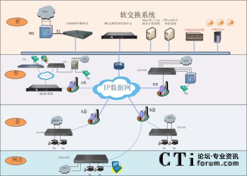 - 地州市分集團根據實際情況可部署: CNG6000(32FXS),CNG3000(8FXS+8FXO,16FXS,16FXO),IP語音網關可以當成交換機滿足地州市分集團內部通信要求,也能連接到IP專網,同時能夠利用FXO接口連接到當地的市話。