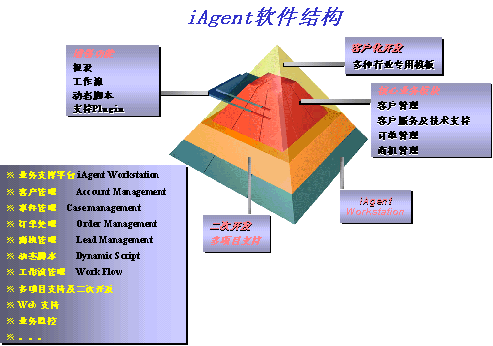 iAgent3.0從軟件內(nèi)部的結(jié)構(gòu)體系上加以突破,統(tǒng)一開放的應(yīng)用平臺上組合功能強大的二次開發(fā)工具,并在此基礎(chǔ)上加以針對行業(yè)而特別設(shè)計的功能模板。更好的適應(yīng)了企業(yè)處理流程的多樣化和需求的復(fù)雜化,并為企業(yè)高速的業(yè)務(wù)增長和功能需求增長帶來極大的拓展空間。軟件結(jié)構(gòu)如下圖所示: