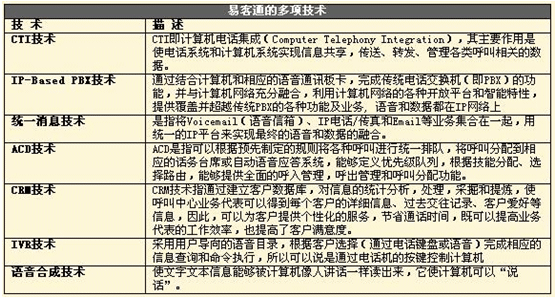易客通將全套的語(yǔ)音、數(shù)據(jù)、互聯(lián)網(wǎng)服務(wù)和豐富的業(yè)務(wù)應(yīng)用整合到單個(gè)系統(tǒng)中(All-In-One),融合語(yǔ)音和數(shù)據(jù),以模塊化的形式提供各種功能(CRM、IVR、多媒體功能、錄音、報(bào)表、管理工具、客戶化產(chǎn)品定制開發(fā)工具、自動(dòng)外撥系統(tǒng)等),滿足不同用戶的需求,系統(tǒng)開放、可靠、易于擴(kuò)展和升級(jí),容易獲得和使用,一切都非常簡(jiǎn)單,可以從容應(yīng)對(duì)e時(shí)代企業(yè)通信系統(tǒng)所面臨的諸多復(fù)雜挑戰(zhàn)。