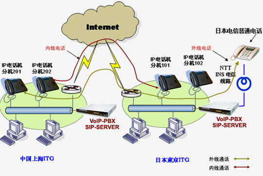 上海愛吉研發(fā)的VoIP-PBX軟交換系統(tǒng)已經(jīng)成功地在上海愛吉和日本愛吉以及日本的客戶間實(shí)施。目前應(yīng)用上海愛吉生產(chǎn)的VoIP-PBX產(chǎn)品,可以實(shí)現(xiàn)從上海愛吉的任意IP電話機(jī)撥打內(nèi)部分機(jī)號(hào),例如:101,成功實(shí)現(xiàn)從Internet互聯(lián)網(wǎng)接通位于日本東京的日本ITG或日本OKI公司的IP電話機(jī),而不產(chǎn)生任何的電信費(fèi)用。另外,目前通過日本的NTTINS 交換機(jī),還實(shí)現(xiàn)了從上海愛吉的IP電話機(jī)可以撥打日本方面的任意普通電話,即日本電信范圍內(nèi)的任意普通電話,而僅僅產(chǎn)生從日本ITG到日本其它地方的短途或國內(nèi)長途費(fèi)用,而沒有上海到日本的國際長途費(fèi)用。具體的網(wǎng)絡(luò)應(yīng)用圖如下所示: