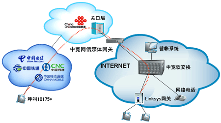 企業(yè)或個(gè)人自行從網(wǎng)站上成功申請(qǐng)“企業(yè)商務(wù)通”或“個(gè)人隨身行”業(yè)務(wù)后,通過(guò)101756*全國(guó)統(tǒng)一接入號(hào)結(jié)合中寬網(wǎng)信推薦的思科linksys網(wǎng)關(guān)或網(wǎng)絡(luò)電話使用,當(dāng)外部對(duì)您申請(qǐng)的10175*號(hào)碼發(fā)起呼叫時(shí),該呼叫通過(guò)中國(guó)聯(lián)通的線路將話務(wù)指向中寬網(wǎng)信的媒體網(wǎng)關(guān),由中寬軟交換平臺(tái)將呼叫送至您指定的電話上。另外,當(dāng)您使用該業(yè)務(wù)外呼時(shí),可以選擇在被叫電話上顯示10175*或隱藏號(hào)碼。