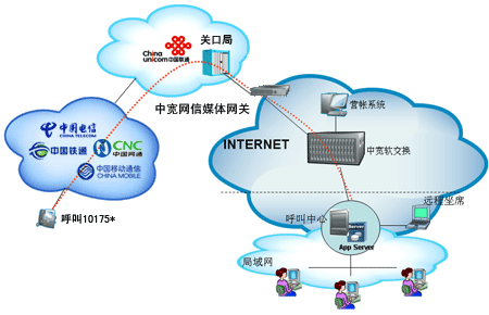 企業(yè)自行從網(wǎng)站上成功申請(qǐng)“企業(yè)商務(wù)通”業(yè)務(wù)后,通過(guò)101756*全國(guó)統(tǒng)一接入號(hào)結(jié)合呼叫中心,當(dāng)外部對(duì)企業(yè)申請(qǐng)的10175*號(hào)碼發(fā)起呼叫時(shí),該呼叫通過(guò)中國(guó)聯(lián)通的線路將話務(wù)指向中寬網(wǎng)信的媒體網(wǎng)關(guān),由中寬軟交換平臺(tái)將呼叫送至指定的呼叫中心,由呼叫中心完成相應(yīng)的服務(wù)。另外,當(dāng)您使用該業(yè)務(wù)外呼時(shí),可以選擇在被叫電話上顯示10175*或隱藏號(hào)碼。