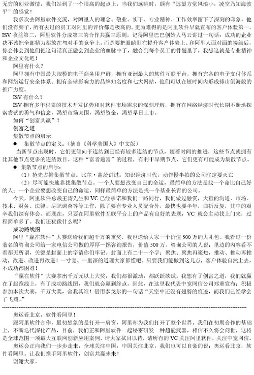 余輝先生在大會(huì)上表示,對(duì)于整個(gè)互聯(lián)網(wǎng)、軟件產(chǎn)業(yè)鏈條來(lái)說(shuō),在線(xiàn)軟件(SaaS)不但是最熱門(mén)的話(huà)題,更是順應(yīng)市場(chǎng)需要的新技術(shù)趨勢(shì),中寬網(wǎng)信將和阿里軟件一起,在打造全球“軟件沃爾瑪超市”的過(guò)程中發(fā)揮自己的技術(shù)應(yīng)用研發(fā)強(qiáng)項(xiàng),為全國(guó)2億互聯(lián)網(wǎng)網(wǎng)民提供更豐富便利、更低成本的軟件服務(wù)。余輝先生還和與會(huì)嘉賓分享了中寬網(wǎng)信和阿里軟件合作過(guò)程中的體會(huì)和感悟。