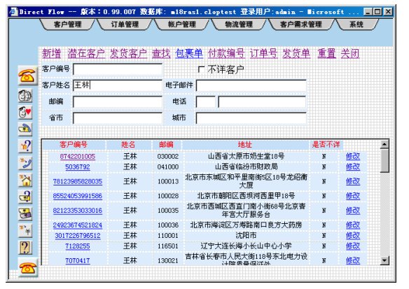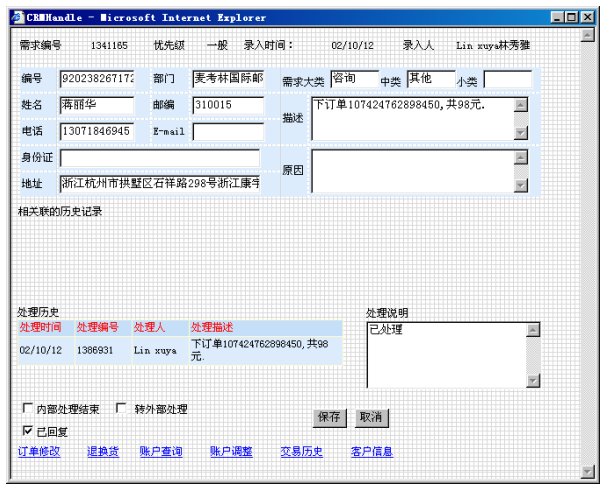 客戶向麥考林定購商品的最常用途徑就是電話訂貨,客戶撥打麥考林服務(wù)熱線進入客服系統(tǒng)。系統(tǒng)會根據(jù)客戶的主叫號碼對客戶進行識別,如果識別成功,座席代表屏幕上會自動彈出客戶資料和以往訂貨記錄;如果識別失敗,座席代表可以根據(jù)客戶通報的客戶代碼或姓名等信息查詢客戶資料。如果是新客戶,座席代表可以立即為他創(chuàng)建客戶檔案。