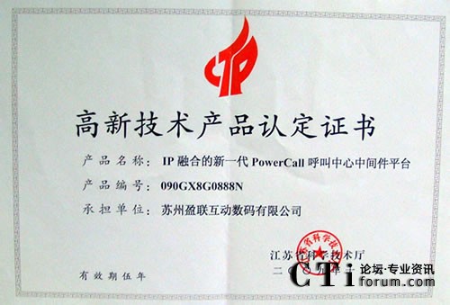 CTI論壇(ctiforum)4月20日消息(記者 楊毅):近日,蘇州盈聯(lián)互動數(shù)碼有限公司榮獲江蘇省科學技術廳頒發(fā)的高新技術產(chǎn)品認定證書,這標志著盈聯(lián)作為一家專業(yè)的呼叫中心解決方案提供商,其產(chǎn)品的先進性和高品質(zhì)已獲得了中國技術部門的官方認可。