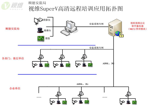 順德安監(jiān)局各部門及下屬單位使用安監(jiān)系統(tǒng)專網(wǎng)進行連接,而重點培育企業(yè)網(wǎng)絡(luò)情況復(fù)雜,涉及ADSL以及3G無線網(wǎng)絡(luò)等多種情況,視維根據(jù)順德安監(jiān)局、局下屬單位及重點培育企業(yè)的分布情況,將服務(wù)器架設(shè)在順德安監(jiān)局總部,并在總部搭建會議室和培訓中心,其他各部門、下屬單位和重點培育企業(yè)為分會場。