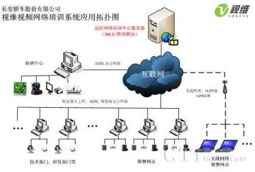 長安轎車大規(guī)模網(wǎng)絡(luò)遠(yuǎn)程會議和培訓(xùn)系統(tǒng)由服務(wù)器端和客戶端組成,服務(wù)器端軟件部署在重慶中心機(jī)房,中心機(jī)房配置1臺單獨(dú)服務(wù)器,支持400個客戶端同時在線,負(fù)責(zé)所有會議和培訓(xùn)的召集、音視頻交互、加密等工作,長安轎車各部門、轄下各零售點(diǎn)通過WEB方式(包括ADSL、3G無線等多種網(wǎng)絡(luò))即可實現(xiàn)客戶端軟件的自動安裝與升級,配備簡單的攝像頭和話筒之后就可以實現(xiàn)長安轎車以及400多零售點(diǎn)的大規(guī)模工作會議和高清音視頻網(wǎng)絡(luò)培訓(xùn)。網(wǎng)絡(luò)拓?fù)鋱D如下: