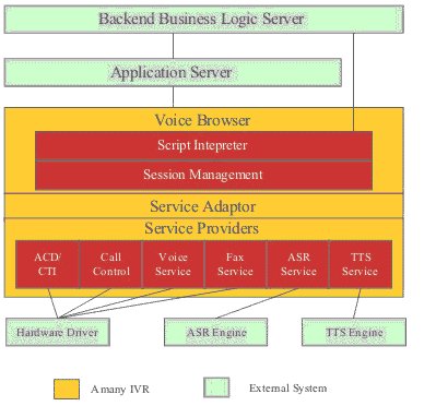 聲通技術(shù)的Amany IVR是集流程編輯環(huán)境、語法解析器和執(zhí)行平臺為一體的通用語音平臺,在這基礎(chǔ)上增加了CTI中間件和TAPI/WAV等方面的技術(shù)支持,使它不僅能作為一個獨立的語音應(yīng)答系統(tǒng)使用,而且可以作為呼叫中心理想的IVR服務(wù)器,并且可以作為外撥服務(wù)器、傳真服務(wù)器、語音門戶網(wǎng)站系統(tǒng)使用,是一個具有國際先進(jìn)水平的綜合性語音平臺;所有的可選功能模塊通過獨有的Plug-in技術(shù)可實現(xiàn)功能模塊動態(tài)卸載,使客戶可以挑選自己需要的功能模塊,在將來需要的時候在配置相應(yīng)的功能模塊,使客戶成本大大降低,同可以保證將來系統(tǒng)平滑升級,使用擁有更多的選擇。