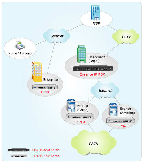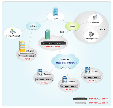 Essence IPBX系列可以注冊(cè)者之形式注冊(cè)于其他SIP協(xié)定伺服器上,如ITSP運(yùn)營(yíng)平臺(tái),或是分公司之小型IP PBX注冊(cè)至總公司之大型IP PBX ,均可透過Internet 將話務(wù)無限延伸。