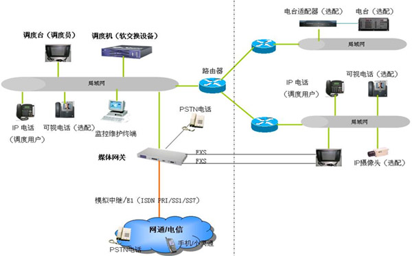 IP指揮調(diào)度語音通信系統(tǒng)由調(diào)度機、調(diào)度臺、媒體網(wǎng)關(guān)、IP電話、電臺適配器、電臺等設(shè)備組成,整體系統(tǒng)采用軟交換網(wǎng)絡(luò)的結(jié)構(gòu),構(gòu)建于以太網(wǎng)之上。傳輸網(wǎng)絡(luò)由通過路由器連接的多個局域網(wǎng)構(gòu)成;