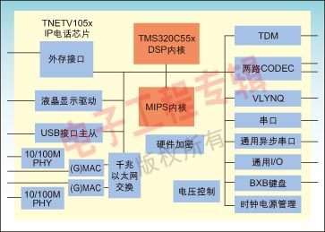 TNETV1050芯片包含一個(gè)內(nèi)置的以太網(wǎng)交換機(jī)以及雙PHY,可以在桌面上提供IP電話服務(wù)的同時(shí),提供一個(gè)PC連接。TNETV1050的USB接口可以使IP電話連接多種USB設(shè)備,如PDA等。設(shè)計(jì)者還可以通過(guò)TI的VLYNQ接口擴(kuò)展多種其他功能,例如Wi-Fi模塊,硬件加密等。芯片集成了LCD控制器、CODEC以及鍵盤(pán)接口,降低了系統(tǒng)成本。