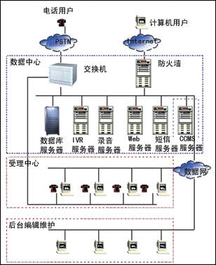 系統(tǒng)的體系結(jié)構(gòu),主要包括三個部分:數(shù)據(jù)中心、受理中心和維護中心。受理中心與數(shù)據(jù)中心之間采用E1連接,具有2M的數(shù)據(jù)通信能力;維護中心與數(shù)據(jù)中心之間采用64K DDN線路連接,三個中心分布在三個不同的地方。目前受理中心負責全省的所有業(yè)務(wù),客戶通過本地市話經(jīng)由移動電信網(wǎng)絡(luò)將話路指向受理中心,通過數(shù)據(jù)中心的具有排隊功能的交換機,根據(jù)被叫號碼和客戶服務(wù)要求,將講話路轉(zhuǎn)接到自動臺或人工臺席,為客戶提供服務(wù)。當用戶呼叫信息臺電話后,進入到交換機,交換機將來話消息通知驅(qū)動池,驅(qū)動池將相關(guān)消息轉(zhuǎn)換為標準格式,通知CCMS,CCMS根據(jù)來話被叫號,根據(jù)管理系統(tǒng)的定義,啟動相應(yīng)的IVR腳本,交給IVR解釋器解釋并由IVR服務(wù)器執(zhí)行,當服務(wù)為自動臺完成時,由IVR服務(wù)器實現(xiàn)(如:語音引導、適合自動服務(wù)的內(nèi)容等);當用戶需要人工服務(wù)時,CCMS管理系統(tǒng),根據(jù)用戶的服務(wù)要求,按照話路分配原則(通過管理系統(tǒng)定義),選擇最合適的話務(wù)員為其服務(wù),同時CCMS管理系統(tǒng)會將相關(guān)的頁面在話務(wù)員的臺席上顯示出來,同時顯示主叫號碼以及來話標示,當話務(wù)員應(yīng)答后,即可開始受理,受理的內(nèi)容通過Web服務(wù)器完成,同時對于需要查詢數(shù)據(jù)庫的訪問,通過應(yīng)用服務(wù)器,進行數(shù)據(jù)訪問,并返回結(jié)果。當服務(wù)完畢,本次呼叫即結(jié)束。
