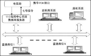 系統(tǒng)由以下部分組成:CTI服務(wù)器、接警席位系統(tǒng)、班長(zhǎng)席位系統(tǒng)、局長(zhǎng)席位系統(tǒng)。各部分系統(tǒng)可根據(jù)實(shí)際需求任意組合,各個(gè)部分充分考慮到開發(fā)的實(shí)用性、可靠性、先進(jìn)性和開放性,能夠?qū)④浖S護(hù)降到最小程度,這樣的設(shè)計(jì)可以讓用戶能夠改動(dòng)硬件和數(shù)據(jù)庫,卻不用將軟件整體更換,保證了用戶的投資。其結(jié)構(gòu)如圖2所示。