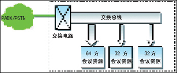 在圖1中,系統(tǒng)擁有一個64方、兩個32方共三組會議資源,也就是說,這個系統(tǒng)最多可同時召開一個64方會議和兩個32方會議。由于各會議組之間無法共享資源,所以既不能召開所有話路均參加的大會,也不能同時召開大量的小型會議。