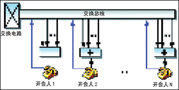 三匯的cPCI系列語音卡對此進行了大量改進,充分利用了DSP飛速發(fā)展的強大的計算能力,使用了分布式會議技術。分布式會議技術是將電話會議所需要的關鍵部件(混音器)分布到每一個話路上,使得每一個話路都擁有電話會議所需的基礎結構,再利用交換總線傳輸話音,將需要發(fā)言的通道獨立送入每個通道的混音器,再通過一個會議調度程序進行實時控制,從而實現(xiàn)了基于分布式技術的交互式會議功能。圖2是采用分布式會議技術的基本原理。