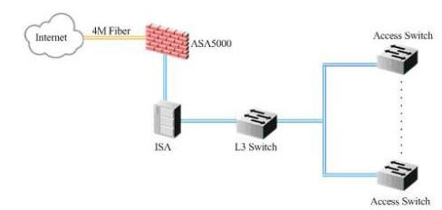 辦公專用網(wǎng)通過(guò)一條4M光纖線路連入CNC網(wǎng)絡(luò),在酒店內(nèi)部安裝了ASA5000和ISA等安全管理設(shè)備,ISA承擔(dān)了NAT等功能;辦公網(wǎng)的信息點(diǎn)數(shù)量大概在200個(gè)左右。