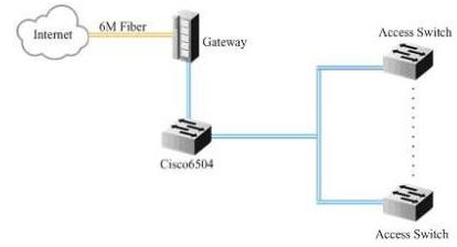 客房局域網(wǎng)通過(guò)一條6M的光纖接入CNC網(wǎng)絡(luò),網(wǎng)關(guān)設(shè)備承擔(dān)了DHCP、NAT和流量限制等功能,同時(shí)在思科6504上安裝有安全板卡,對(duì)內(nèi)部網(wǎng)絡(luò)安全進(jìn)行加強(qiáng)和防御。由于每個(gè)客房有2~3個(gè)信息點(diǎn),客房局域網(wǎng)總共有1300個(gè)左右的信息點(diǎn)。