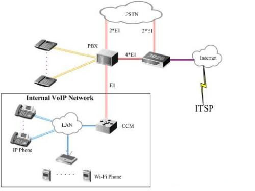 iBG3026,最后在PBX和Ubigate iBG3026之間再開(kāi)通4條E1中繼,同時(shí),Ubigate iBG3026通過(guò)自帶的GE接口接入酒店的辦公局域網(wǎng),這樣即使出現(xiàn)客房人員使用網(wǎng)絡(luò)不規(guī)范的情況發(fā)生,也不會(huì)影響語(yǔ)音服務(wù)的質(zhì)量。