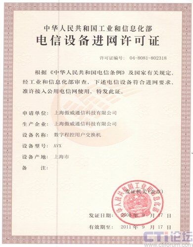近日,國內(nèi)知名的VOIP全系列產(chǎn)品和解決方案提供商---傲威通信科技有限公司,自主研發(fā)的AVX系列語音電話交換機順利通過工業(yè)與信息化部審核,取得“電信設(shè)備進(jìn)網(wǎng)許可證”。此舉標(biāo)志著傲威通信的AVX系列產(chǎn)品已成功取得接入國家電信網(wǎng)的資質(zhì),為大規(guī)模的推廣應(yīng)用打下了堅實基礎(chǔ)。
