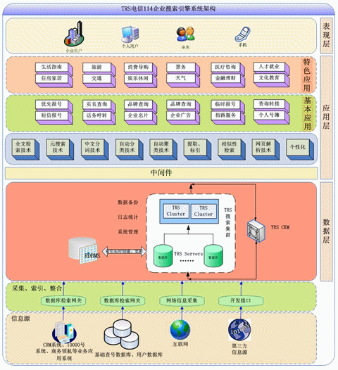 TRS公司結合電信行業(yè)114業(yè)務應用需求,依托自身企業(yè)搜索引擎產(chǎn)品和中文信息處理技術,推出的的電信114企業(yè)搜索引擎解決方案,能夠全面整合索引搜索電信114業(yè)務應用的信息內容,并向用戶提供高效的、準確的、安全的、個性化的搜索體驗。其框架圖如下: