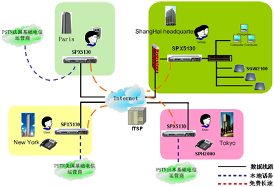 隨著公司在全世界開設(shè)眾多的部門,IP電話技術(shù)將會(huì)是不同分公司之間實(shí)現(xiàn)低費(fèi)用高品質(zhì)語音通訊的方式。SINOCO公司的IP-PBX 系統(tǒng)解決方案,利用 SPX-5130設(shè)備通過互連網(wǎng)連接到公司的各個(gè)分支機(jī)構(gòu),提供分級(jí)體系結(jié)構(gòu),更進(jìn)一步提供了可靠的,靈活的語音通訊解決方案,從而滿足公司快速回應(yīng)客戶的需求。同時(shí),它也降低了總部和分部之間的電話費(fèi)用?偛亢头植块g昂貴的國際電話費(fèi)用將不再存在, 而且享受高品質(zhì)的語音通訊質(zhì)量。