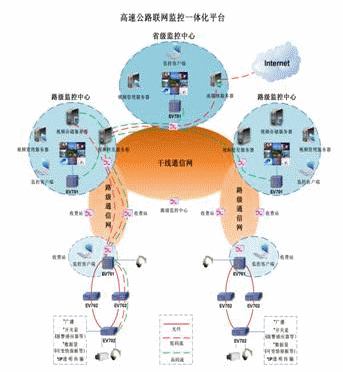 采用H.264編碼標準的EV702外場綜合接入設(shè)備,將原來外場分散的攝像頭、快球、云臺、可變情報板、報警感應(yīng)器等設(shè)備融為一體,同時也支持MPEG編碼標準的視音頻接入。EV702配備光纖通信板卡,不需要光端機,可以直接連接光纖,進行遠距離。通過EV702連接成環(huán),并且具有自愈功能?蛇M行集中式(路級監(jiān)控中心)、分布式(各級監(jiān)控中心)存儲。路級中心、區(qū)域中心、省級中心分布式多級監(jiān)控,由省中心統(tǒng)一設(shè)定權(quán)限,進行集中管理。