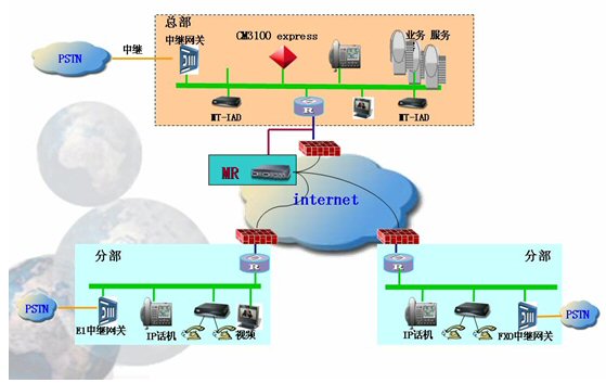 由于電信運(yùn)營商的線路租賃費(fèi)用非常昂貴,對于中小企業(yè)來說是一項(xiàng)不小的負(fù)擔(dān),所以中小企業(yè)的組網(wǎng)方式一般采用ADSL方式,來降低費(fèi)用,而ADSL的組網(wǎng)方式往往都經(jīng)過了幾層地址轉(zhuǎn)換了,這樣在分部或分支機(jī)構(gòu)的IP電話終端就無法穿透防火墻,實(shí)現(xiàn)和外面成功通話,所以需要在總部配置1臺媒體路由器(MR)來做語音代理,完成呼叫連接的建立。