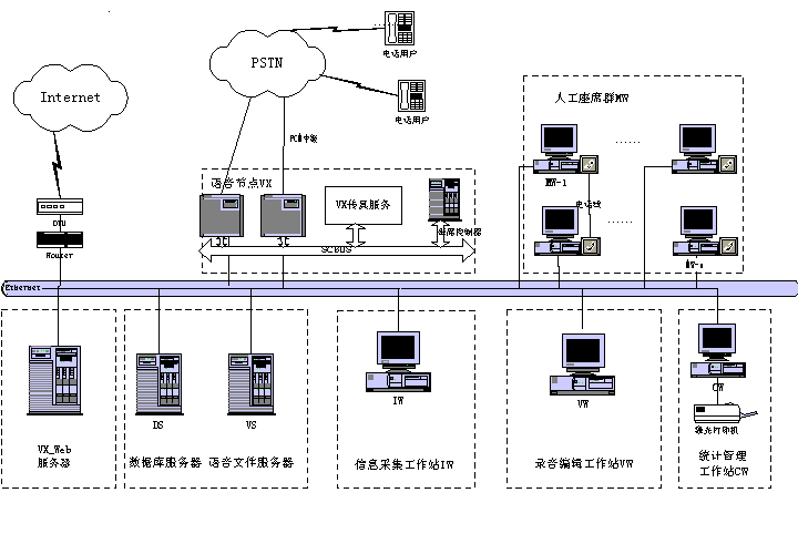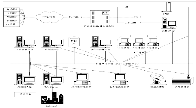 客戶服務中心系統(tǒng)包含智能排隊機(含接入服務器)、核心服務器CCS、交互式語音應答系統(tǒng)IVR、語音傳真服務器、業(yè)務服務器、工作流服務器、數(shù)據(jù)庫服務器、Internet/Intranet服務器、人工座席、尋呼機接口,手機短消息接口等組成。如下圖所示為Runsun呼叫中心系統(tǒng)結構圖: