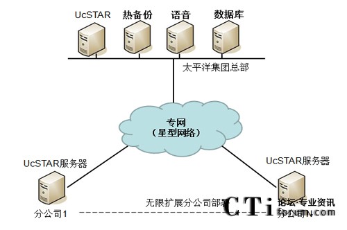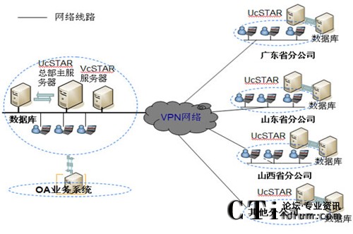 在公司總部部署主UcSTAR服務(wù)器,全國省級分公司分別部署一套子UcSTAR服務(wù)器,組成星型結(jié)構(gòu)公司內(nèi)部的溝通與協(xié)作系統(tǒng)。
