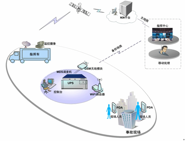 MDS調(diào)度機通過衛(wèi)星道與政府的NGN平臺對接,實現(xiàn)與整個城市的通信系統(tǒng)對接;并通過GSM、CDMA備份線路,實現(xiàn)多通信通道的實時切換,選擇最好的路由進行通信。MDS調(diào)度機負(fù)責(zé)語音通訊、調(diào)度作業(yè)和指令消息轉(zhuǎn)發(fā);應(yīng)急指揮車配備調(diào)度機、調(diào)度臺、移動調(diào)度終端、衛(wèi)星接收設(shè)備、監(jiān)控視頻設(shè)備及其他設(shè)備。所有的調(diào)度語音終端都可與MDS調(diào)度系統(tǒng)對接,實現(xiàn)調(diào)度功能及與其他的通信終端進行通信。
