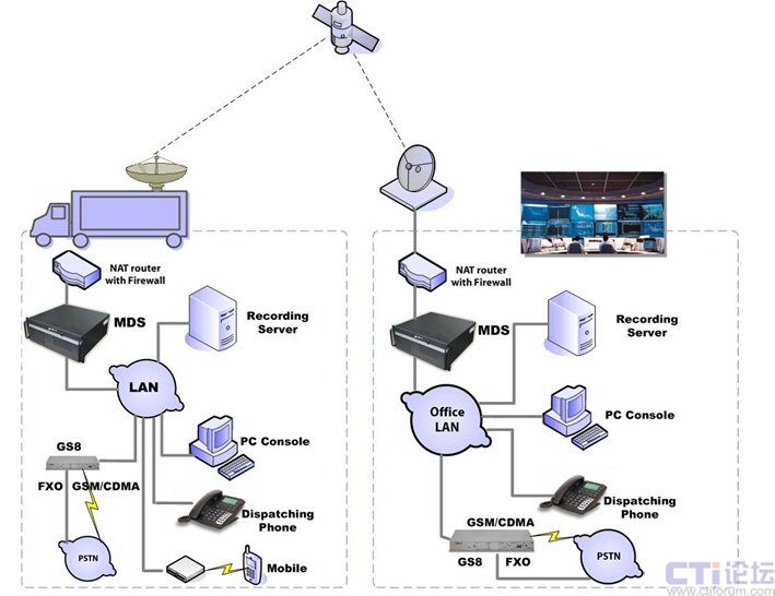 Zed-3的車載調(diào)度系統(tǒng)支持多種接口,通過(guò)無(wú)線網(wǎng)關(guān)提供的GSM、CDMA或模擬中繼端口,可以實(shí)現(xiàn)與固定電話、手機(jī)等外部電話的互通。即使在現(xiàn)場(chǎng)沒有任何可用的外線資源,例如沒有模擬電話接口,手機(jī)卡沒有信號(hào),也仍然可以通過(guò)衛(wèi)星鏈路將呼叫連接到指揮中心的網(wǎng)關(guān)設(shè)備再落地,最大可能的保證現(xiàn)場(chǎng)調(diào)度系統(tǒng)與外部電話的通信。