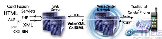 類似地,在Voxeo網(wǎng)絡(luò)上,語音應(yīng)用遵從與標(biāo)準(zhǔn)Web頁面相同的瀏覽器模型。所不同的是,不是采用HTML,而是使用電話標(biāo)記語言(VoiceXML、CCXML或CallXML)來編寫頁面。經(jīng)過Voxeo VoiceCenter網(wǎng)絡(luò)的處理,這些頁面將把語音返回給呼叫方。如下圖所示: