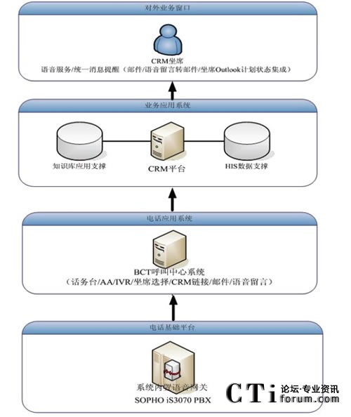 原先電話系統(tǒng)與CRM系統(tǒng)是獨(dú)立的兩個(gè)系統(tǒng),客服人員面對(duì)大量的客戶,迅速的獲悉來電客戶的身份、背景資料以及歷史資料在很大程度上決定了其服務(wù)質(zhì)量。BCT呼叫中心系統(tǒng)位于PBX與CRM之間,作為一個(gè)中間的橋梁,對(duì)PBX送來的電話信息或者用戶輸入的卡號(hào)等數(shù)據(jù)進(jìn)行處理分析,對(duì)主叫號(hào)碼或用戶輸入卡號(hào)進(jìn)行識(shí)別后,傳遞給CRM;CRM檢索與其相連的HIS(醫(yī)院信息系統(tǒng))的數(shù)據(jù)庫,將客戶資料以及相關(guān)的歷史記錄通過彈出網(wǎng)頁的模式,同步的顯示在坐席的計(jì)算機(jī)上,方便客服代表的輸入和后續(xù)操作,提高了效率與正確率。同時(shí),客戶代表還可以在CRM頁面中點(diǎn)擊電話號(hào)碼,通過BCT發(fā)起電話呼叫來聯(lián)系客戶,來處理用戶回訪等工作。
