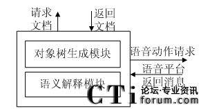 作為VoiceXML語言的解釋工具,文檔解析是VoiceXML解析器主要任務(wù),也是執(zhí)行引擎的重要組成部分,文檔解析的內(nèi)容決定了執(zhí)行平臺的下一步操作,也是整個系統(tǒng)運行的核心。因為VoiceXML文檔首先是一個XML文檔,所以主要包含對象樹生成模塊和語義解釋模塊兩個部分。其中對象樹生成模塊是對VoiceXML文檔進行XML方式的解析,解釋模塊使用FIA算法對生成的對象進行解析。圖3.13描述了VoiceXML解析器文檔解析的模型。